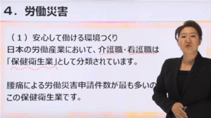 本講座では、まず腰痛とは何か、介護における腰痛の原因、安心して働ける環境づくりについてを学びます。次に、介護場面においての腰痛予防策、日常場面においての腰痛予防策、もし腰痛になった場合に慢性化させないための対策についてを学びます。