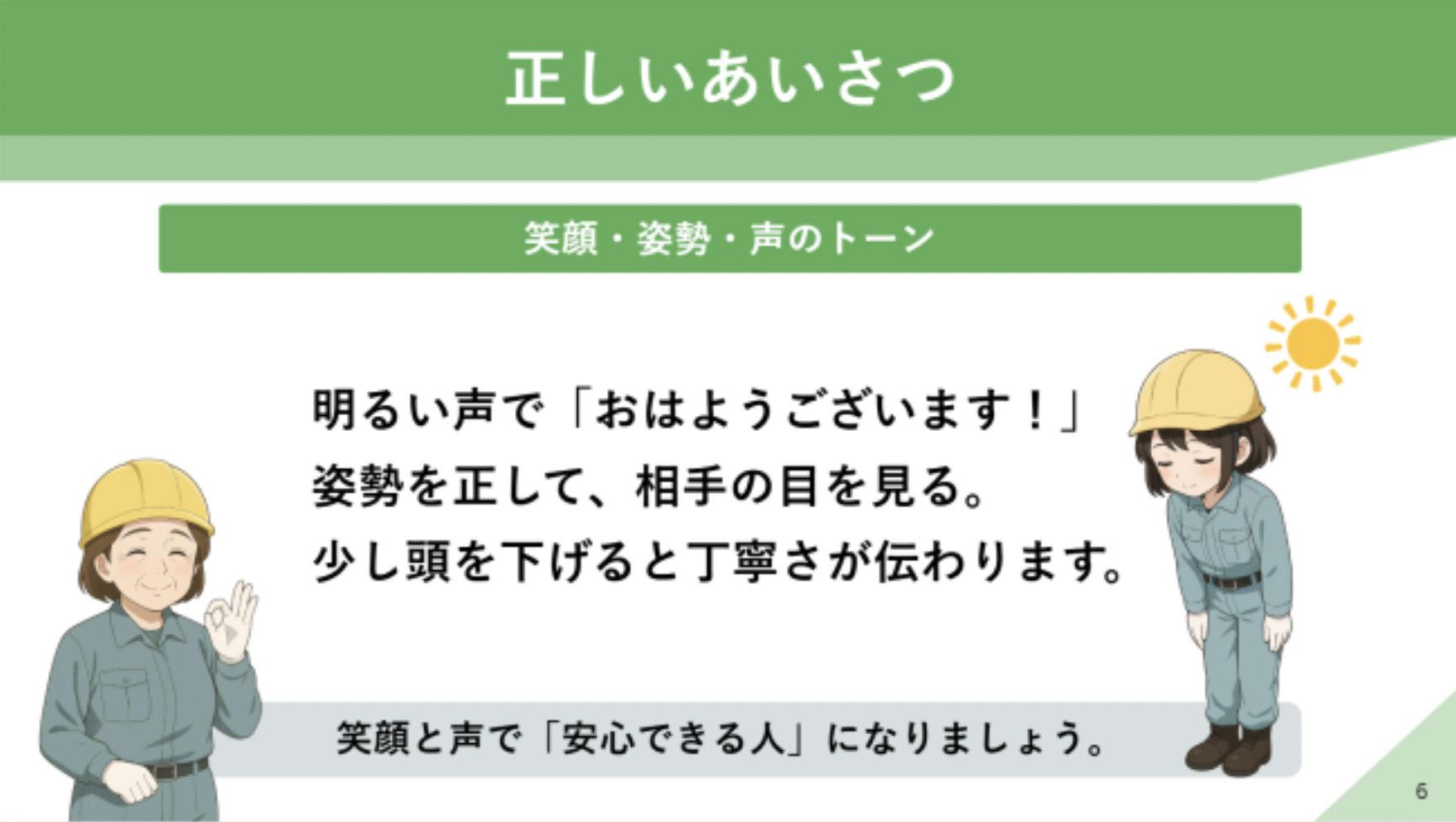 「おはようございます」の声の出し方、「はい、わかりました」の返事の仕方、 「〇〇さん」の敬称の使い方など、日本独自のコミュニケーション文化を実践的に習得できます。 「たぶん」「あとで」などのNG表現を避け、「いつ・どこで・なにが」の報告順序をマスター。 入職初日から上司や同僚に信頼され、安全で円滑な職場づくりに貢献できる人材へ成長します。
