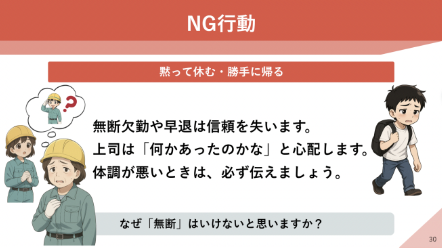 日本の職場で信頼される「伝え方」を3つのテーマで体系的に学びます。 基本のあいさつ・返事・敬称の使い方から、問題発生時の報告・連絡・相談(ホウレンソウ)、 体調不良や予定確認などシチュエーション別の伝え方まで網羅。 ヒヤリハット事例を通じて「言わないこと」が危険につながる理由を理解し、 短く・正確に・正直に伝える力を身につけます。