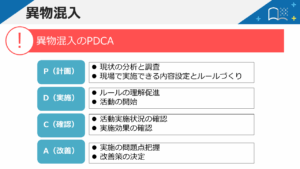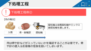 食品を扱うにあたり、あってはいけないのが「異物混入」になります。これを踏まえ、工場への入場時に気をつけること、工場内に持っていってはいけない物、検品時の注意点など一連の流れを学ぶことができ、スキルアップに繋がります。