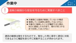 お客様に安心をしていただけるような安全な食品を作るためには、どのように行動すべきかを学べる講座となっています。異物混入を避けるために作業場で行うべきこと、受け入れ検品の際に確認する項目などをわかりやすく説明しています。