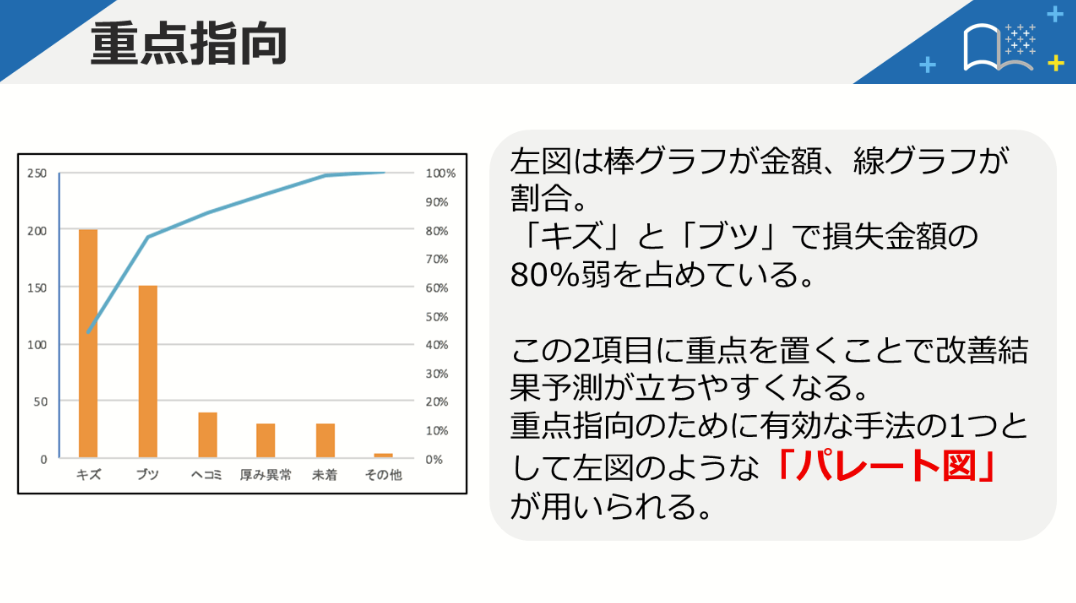 初級では、データを読む力・考える力を身につけさせることが出来ました。中級ではそれを改善する方法を学習していきます。データを見て判断できる知識を身につけ、改善に欠かすことができないパレート図の作成までができるようになります。