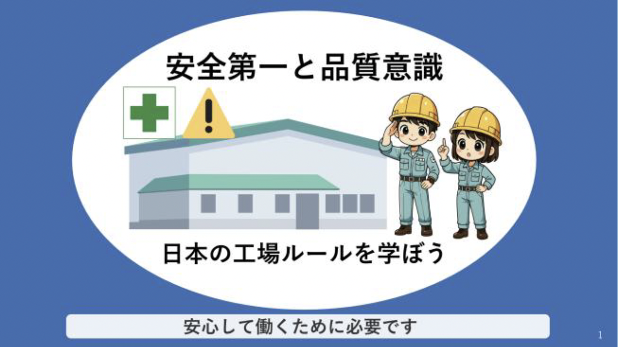 日本の工場で重視される「安全第一」と「品質意識」を学びます。安全標語、5S(整理・整頓・清掃・清潔・しつけ)、 ホウレンソウ(報告・連絡・相談)、身だしなみ、作業前後のルールなど6つのテーマを解説します。 「なぜダメか→正しい行動→なぜ良いか」の流れで、日本の工場文化を理論的に理解します。 スライドとイラストで視覚的にわかりやすく、実践的な安全作業の習慣を身につけます。