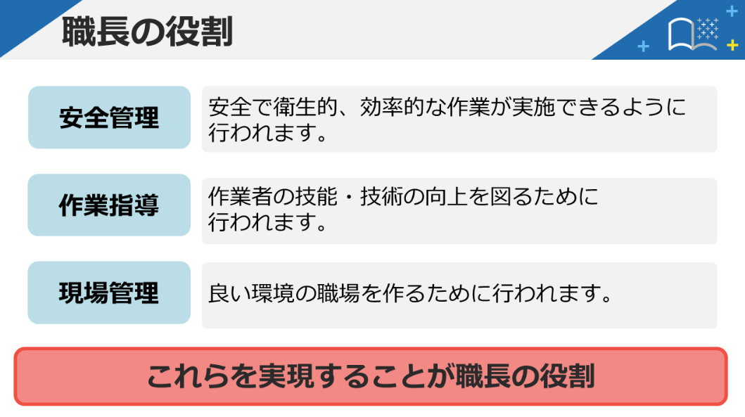 指導や改善の方法などは職長の知識と必要不可欠なものです。具体的な手法を学ぶことで職場での指導や改善を進めることができるようになります。作業者よりも高いレベルで仕事をできる土壌を作ることができます。
