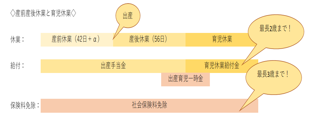 出産・育児をする場合は、その期間について法律で定められている休業があります。