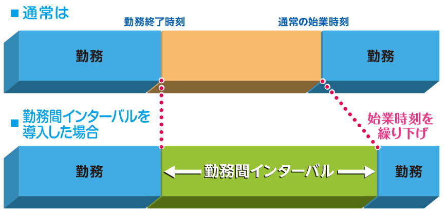 勤務間インターバル制度とは、1日の勤務終了後から翌日の出社までの間に、一定時間以上の休息時間(インターバル)を設けることで、働く方の生活時間や睡眠時間を確保するものです。