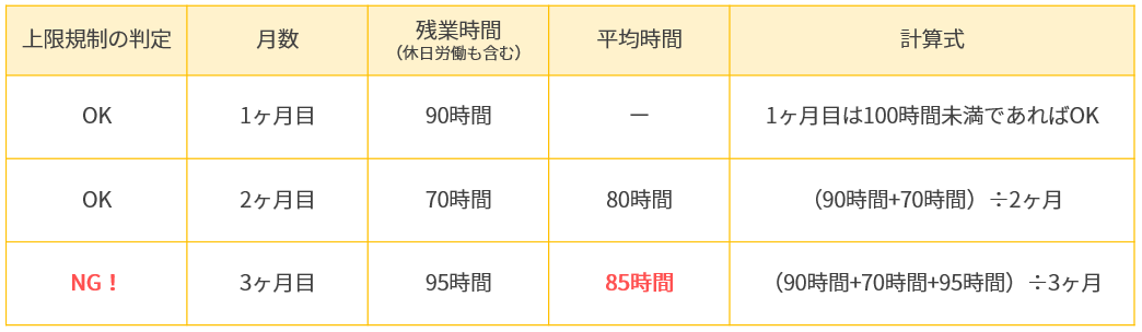 「5ヶ月平均」「6ヶ月平均」が全て1月当たり80時間以内である。