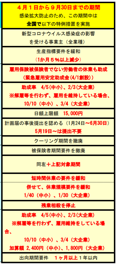 今回は新型コロナウイルス感染症の拡大を考慮し、新たに特例措置が作られ、支給対象となる事業主や助成率など、多くの拡充措置が図られています。