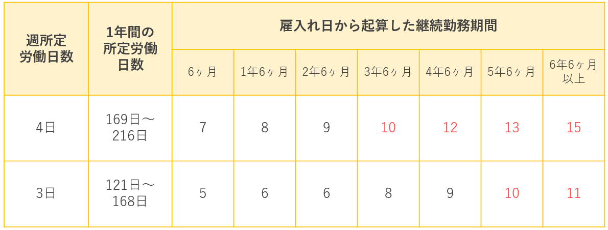 下の表は付与される年次有給休暇の最低限の日数を示しています。