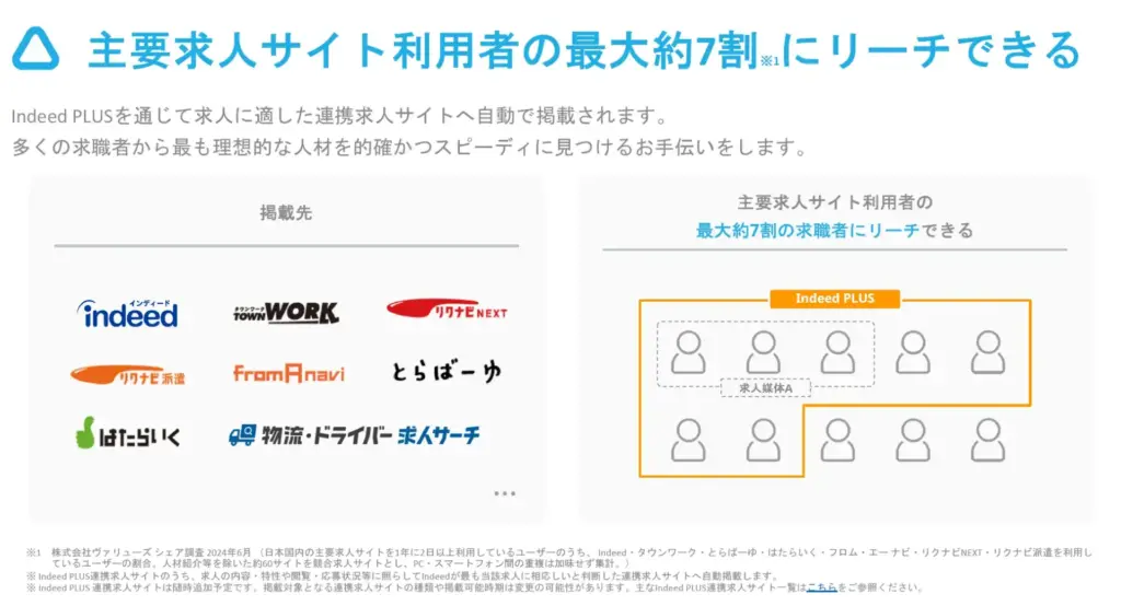※Indeed PLUS 連携求人サイトは随時追加予定です。掲載対象となる連携求人サイトの種類や掲載可能時期は変更の可能性があります。主なIndeed PLUS連携求人サイト一 覧はこちらをご参照ください。