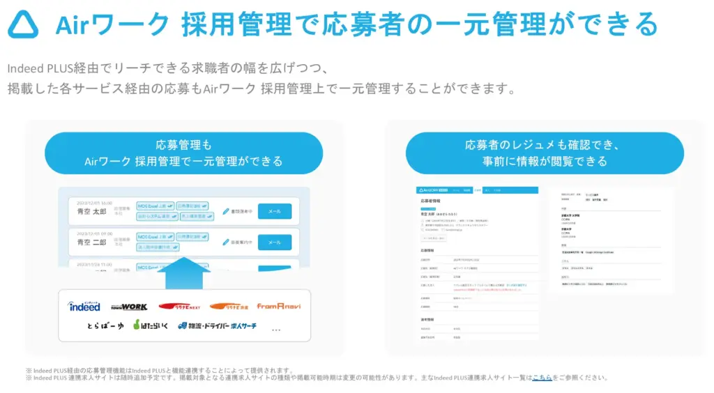 応募者管理の一元化Indeed PLUS経由で複数の求人サイトから応募があった場合でも、すべてAirワーク 採用管理上で一元管理が可能
