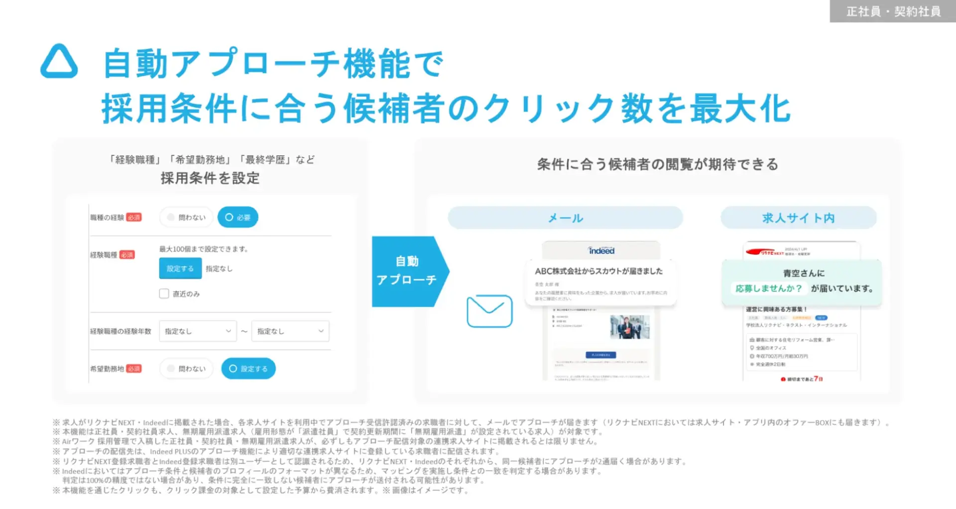 条件に合う応募者へのアプローチ設定した条件に合致した複数の求職者に対し、まとめて自動でアプローチできる(手動でのアプローチも可能)