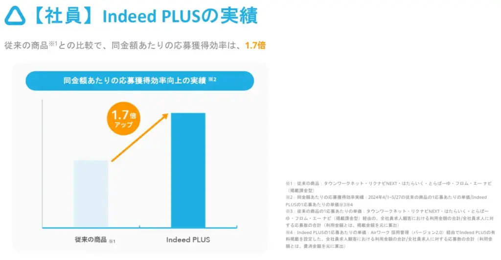 Airワーク 採用管理(バージョン2.0)にバージョンアップすることによるメリットは、有料の「Indeed PLUS」を追加することで実感できます。主なメリットは以下のとおりです。