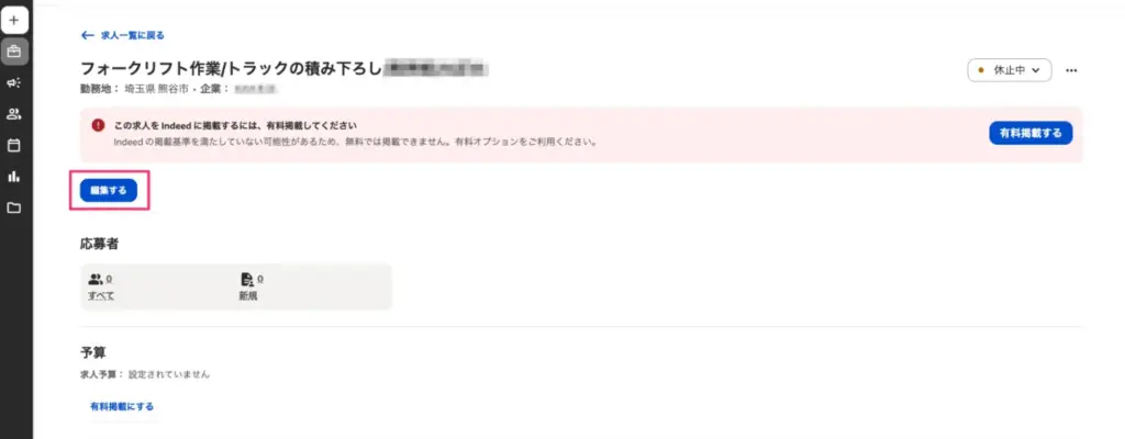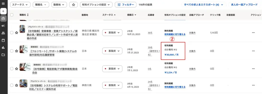 | ② | 有料オプションの設定各求人が無料掲載か、有料掲載なのか確認できる。有料掲載の場合は、一定期間にかかった合計費用と予算が表示される |