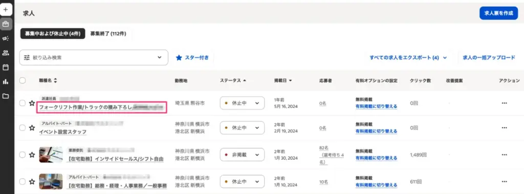 求人情報はホーム画面で一覧表示されます。別のページを開いている場合には、左にあるメニューバーから求人の管理画面を開きましょう。