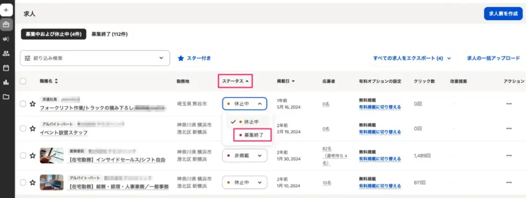 休止または終了したい求人のステータスを「休止中」または「募集終了」に変更するだけで完了です。