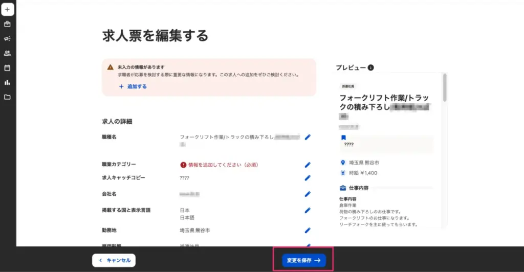 すると、求人票の作成画面が出てくるので、項目を埋めていきましょう。