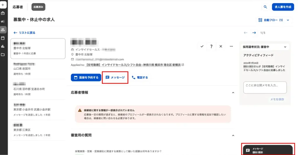 管理画面では、応募者の情報や面接予定、進捗状況、メッセージのやり取りの確認、メッセージの送信ができます。