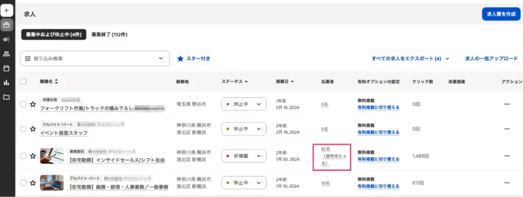 求人の一覧画面を開き、確認したい職種の「応募者」欄の数字をクリックします。