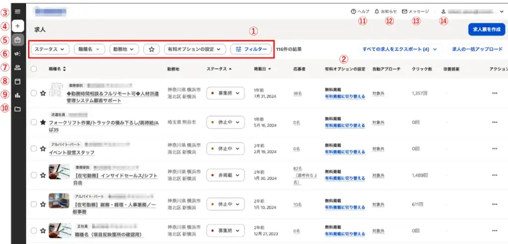 | ① | 確認したい求人の絞り込みステータス・職種名・勤務地・☆(お気に入り)・有料オプションの設定項目での絞り込みができる。フィルターでは、絞り込み条件の一括設定が可能行 |