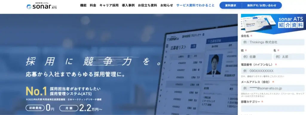 Thinkings株式会社が運営する「sonar ATS(ソナー エーティーエス)」は、新卒・中途など、あらゆる採用活動を一つのシステムでまとめて管理できる採用管理システムです。プログラミング知識がなくてもノーコードで複雑な採用フローを設計でき、業界最大級のHRサービスとの連携実績も強みとしています。