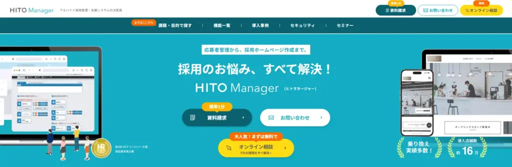 HITO Managerは、最も早く登場したIndeed PLUS連携ATSで、飲食店やスーパー、カラオケといった店舗での導入実績が豊富です。システム移管時には、求人原稿の作成や登録作業を代行してくれるため、導入時の負担を大幅に軽減できます。