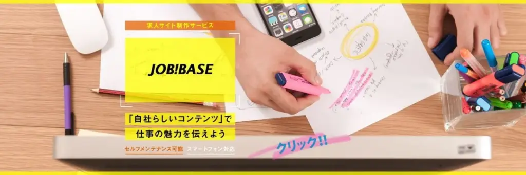 株式会社アドヴァンテージが運営する「JOB!BASE(ジョブベース)」は、応募者を管理するATSというよりも、ドラッグ&ドロップで自社採用サイトを構築・運営するためのCMS(コンテンツ管理システム)です。プログラミングの知識がなくてもマウス操作で簡単にページを作成でき、求人媒体のテンプレートや項目数に縛られることなく、自由に求人情報を発信できます。