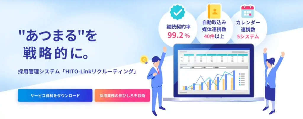 パーソルイノベーション株式会社が運営する「HITO-Linkリクルーティング(ヒトリンク)」は、契約継続率99.2%という高い顧客満足度を誇る採用管理システムです。業界トップクラスとされる40種類以上の求人媒体と連携しており、人材紹介会社やダイレクトリクルーティング(DR)など、あらゆる応募経路からの候補者情報を一元管理できるのが特徴です。