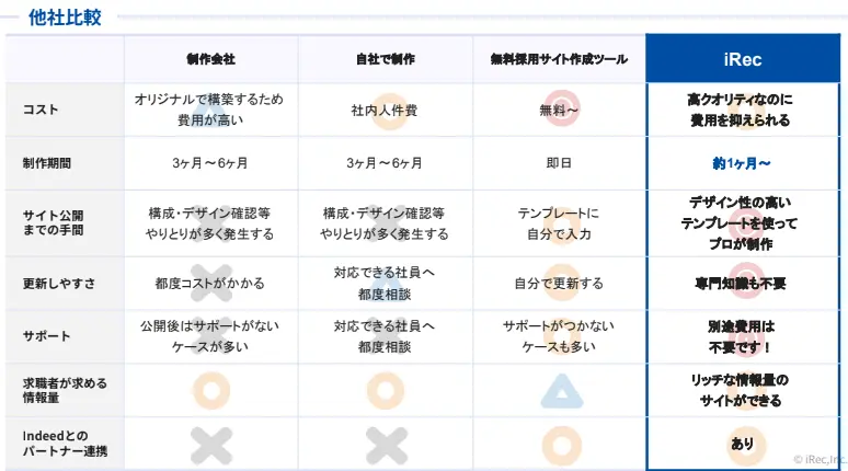アイレックと一般的な採用サイト制作支援サービスには、いくつかの違いがあります。各サービスの特徴は、以下のとおりです。