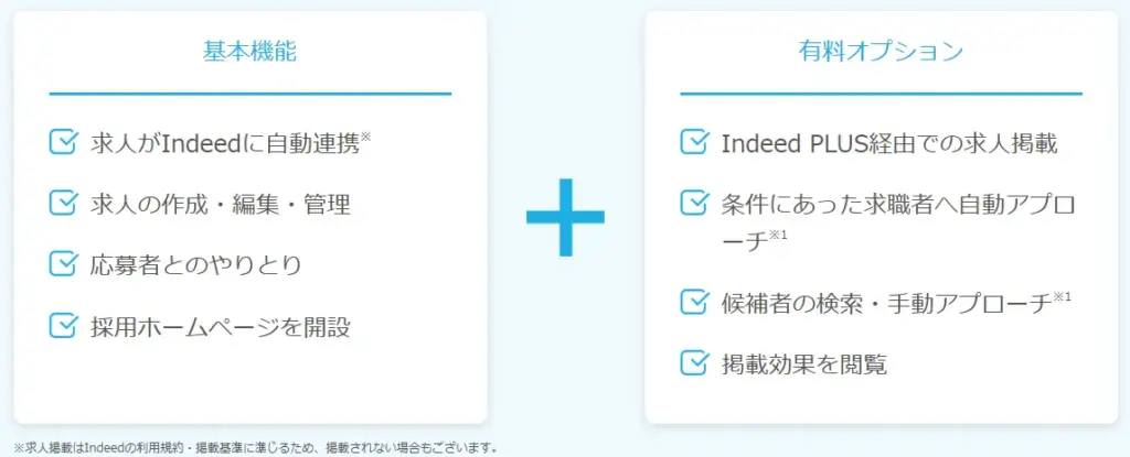 また、Indeedの規約や掲載条件を満たしていれば、求人情報がIndeedに自動で掲載される機能も備わっています。より効果的な採用活動をめざす事業者向けに有料オプションも用意されており、採用ニーズや規模に応じて柔軟に対応できる設計です。
