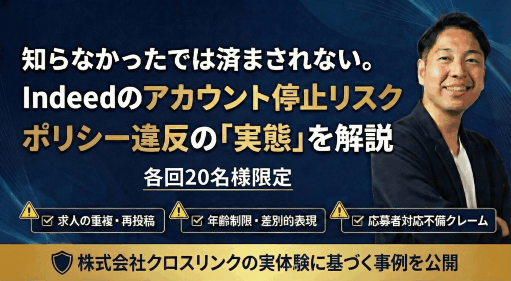 しかし、ただ規約を恐れるだけでは、採用成果を最大化することはできません。 本セミナーでは、数多くのアカウント復旧に携わってきた弊社クロスリンクが、実体験に基づき、「Indeedにおける掲載停止リスク」と「アカウントを守るための鉄則」を公開します。